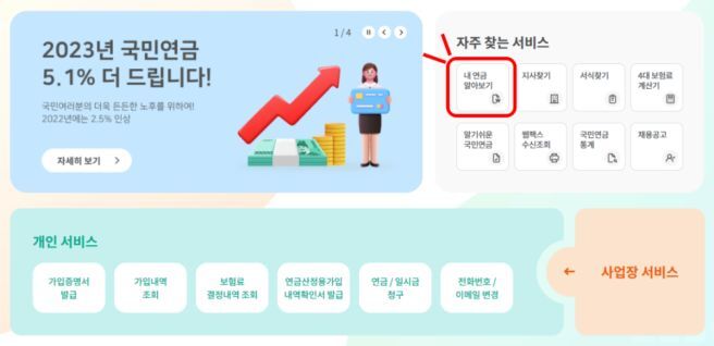 2. 국민연금 홈페이지 메인화면에서 "내 연금 알아보기" 메뉴를 선택합니다.