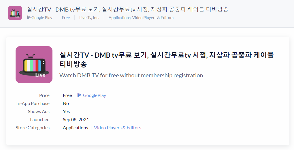 - 특징 : 무료 실시간 TV 및 라디오 방송을 제공합니다.