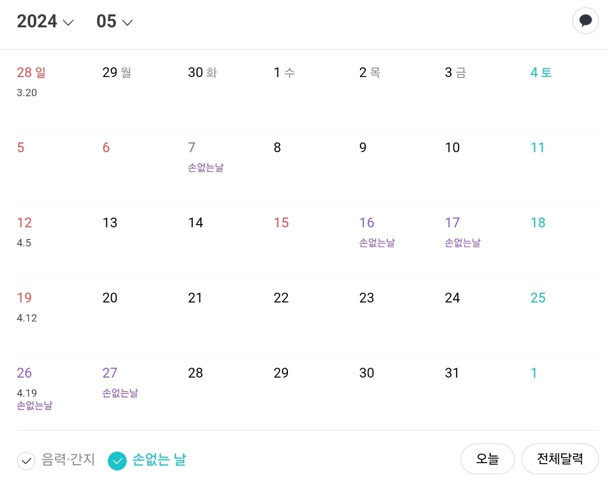 아래는 2024년 5월 손 없는 날 달력입니다.
